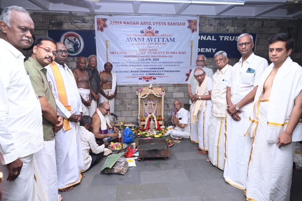ర్యంలో ఆవణి అవిట్టం పేరిట శ్రావణి పౌర్ణమి సందర్భంగా నూతన యజ్ఞోపవీత ధారణ కార్యక్రమం శనివారం వేడుకగా జరిగింది. సంఘ అధ్యక్షులు, గోపురం సంస్థ అధినేత వైవీ హరికృష్ణ సారథ్యంలో అన్నానగర్ లో ఉన్న డాక్టర్ అంబే డ్కర్ అకాడమీ హాలులో 150 మందికి పైగా గృహస్థులు పాల్గొని గాయత్రి దేవికి పూజలు, హోమాలు చేశారు. పూర్ణాహుతి అనంతరం సంప్రదాయ బద్ధంగా యజ్ఞోపవీతధారణ నిర్వహించారు. ముఖ్య అతిధిగా టాబ్లెట్స్ ఇండియా లిమిటెడ్ కార్పొరేట్ అడ్వైజర్ చీమకుర్తి వెంకట సుబ్బారావు మాట్లాడుతూ.. యజ్ఞోపవీత ధారణ సభ్యులందరూ నిర్ణీత స్థలంలో సామూహికంగా వేడుకలు చేసుకోవటం అభినందనీయమన్నారు.సంఘం అధ్యక్షులు వైవీ హరికృష్ణ ముఖ్య అతిథిని ఘనంగా సత్కరించారు. అనంతరం వైవీ హరికృష్ణ మాట్లాడుతూ అన్నానగర్ ఆర్యవైశ్య సంఘం ఆధ్యాత్మికంగానూ, సామాజికంగానూ సేవాలందిస్తుందన్నారు. ప్రతీ ఏడాది ఆర్యవైశ్యులంతా సమిష్టిగా కలసి యజ్ఞోపవీత ధారణ చేసుకోవడం ఆనందంగా ఉందన్నారు. తమ సంఘం తరపున ప్రతిఏడాది 100 మంది పేద విద్యార్థులకు స్కాలర్ షిప్ లను కూడా అందజేస్తున్నట్టు తెలిపారు.