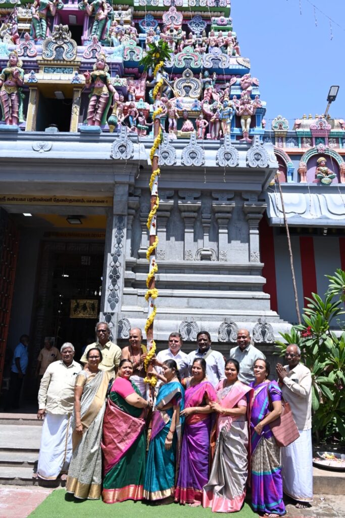 பின்னர், கோயிலின் மகாமண்டபத்தில் பாரம்பரிய கலச பூஜை செய்யப்பட்டது. கோயிலின் பரம்பரை அறங்காவலர் கொல்லா வெங்கட சந்திரசேகர் மற்றும் நிர்வாகக் குழு உறுப்பினர்களான ஊட்டுகுரு சரத்குமார், எஸ்.எல். சுதர்சனம், சி.ஆர். கிஷோர் பாபு மற்றும் டாடா பத்ரிநாத் ஆகியோர் தூண் நிறுவலுக்கு தலைமை தாங்கினர். இந்த நிகழ்ச்சிக்கு எஸ்.கே.பி.டி செயலாளர் எம். கிஷோர் குமார் அவர்கள் ஏற்பாடு செய்து இருந்ததை மேற்பார்வையிட்டார். மேலும் இந்நிகழ்விற்கு முன்னாள் கோயில் வாரிய உறுப்பினர் M. உதய் குமாருடன் நகரின் பல்வேறு பகுதிகளிலிருந்தும் ஏராளமான பக்தர்கள் கலந்து கொள்வார்கள் என தெரிவித்தனர்.